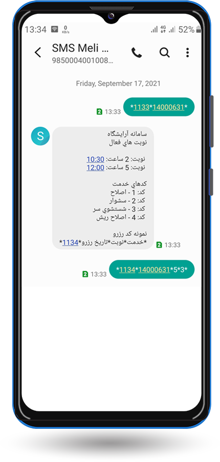 در صورتی که تمایل دارید از طریق سیستم پیامک اقدام به اخذ نوبت نمایید لازم میباشد با ارسال کد پیامکی (*تاریخ*1133*) به سامانه خدمات دهنده به طور مثال (50004001008800) منتظر دریافت اطلاعات نوبت های آزاد و لیست خدمات در تاریخ مورد نظر باشید و با توجه به انتخاب خود بین ساعتها و خدمات ارسال شده مجددا با ارسال کد پیامکی (*کد خدمت*کد نوبت*تاریخ *1134*) جهت اخذ نوبت اقدام نمایید که در صورت ارسال دقیق فرمت کد پیامکی، پیامی مبنی بر ثبت نوبت شما در سامانه ارسال میشود.
