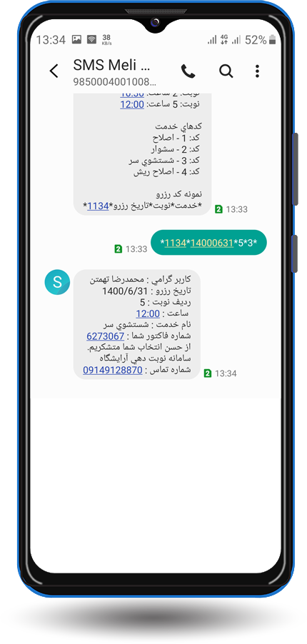 پس از ارسال تاریخ به سامانه نوبت دهی اطلاعاتی حاوی لیست نوبت های آزاد در آن تاریخ و لیست خدمت برای مشتری ارسال میگردد سپس کافی است مشتری با ارسال کد ترکیبی تاریخ شماره نوبت و شماره خدمت نوبت خود را رزرو و پیامک تایید را بدون نیاز به حضور دریافت نماید.